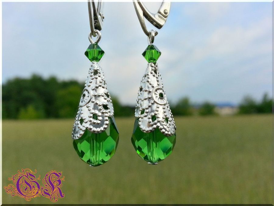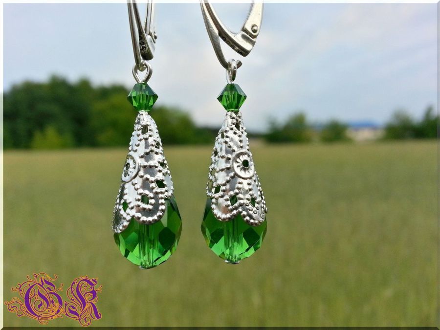 Prezentowane na zdjęciach kolczyki wykonane zostały ze szklanych zielonych kryształków w kształcie sopelków oraz 4mm bicone swarowskiego,elementy ozdobne to śliczne ażurowe posrebrzane wieżyczki.Bigle angielskie pr.925.