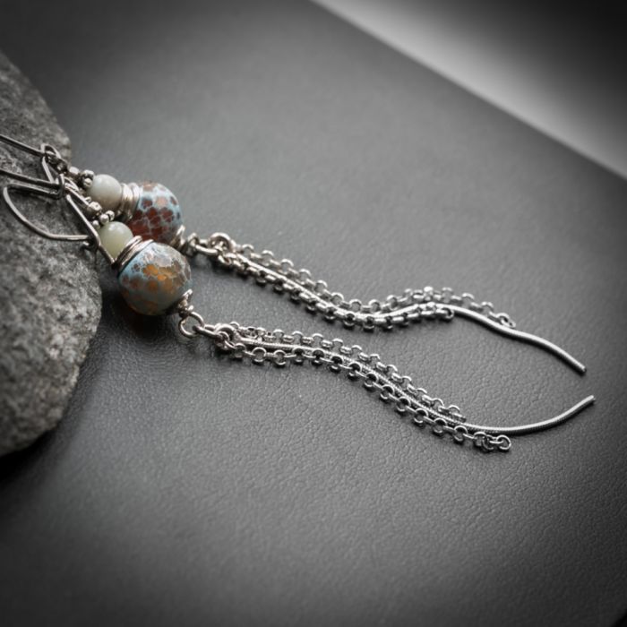 Długie kolczyki, wykonane w całości ze srebra próby 925, oksydowanego (przyciemnianego) i przetartego i kamieni - Agatu fasetowanego w kolorze niebiesko-brązowym ( kamienie są dobarwiane, w zależności od pary mogą lekko różnić się od przedstawionych na zdjęciu, jednak różnice są nieznaczne ), oraz małych amazonitów ( 4mm). Pod kamieniami podwieszone łańcuszki, które kołyszą się ładnie przy każdym ruchu, zwracając uwagę otoczenia.