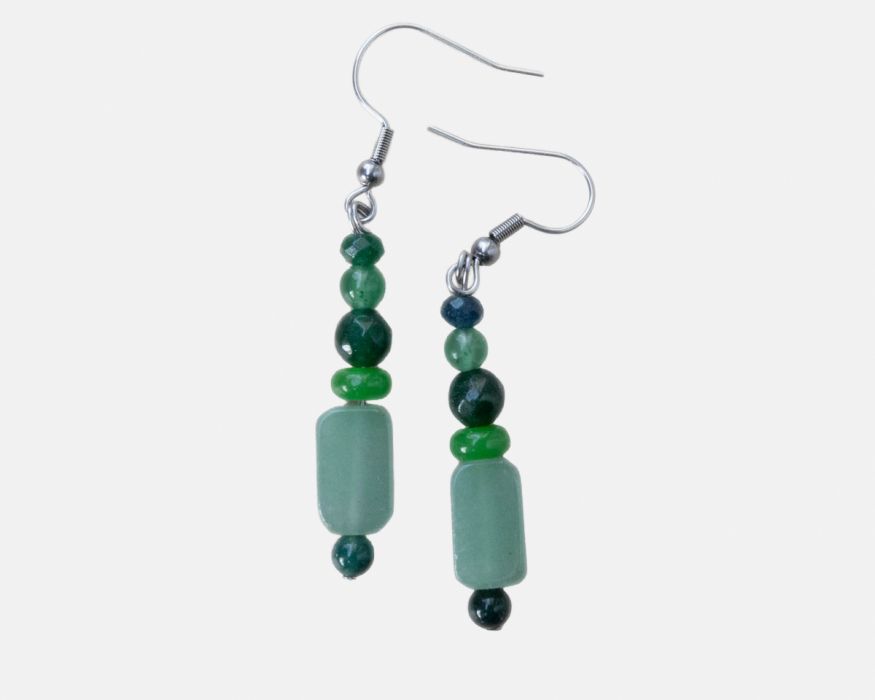 Delikatne i eleganckie kolczyki w odcieniach zieleni, wykonane z naturalnych koralików o różnych kształtach i fakturach. Połączenie jasnych elementów z ciemniejszymi kamieniami tworzy harmonijną i przyciągającą wzrok kompozycję.