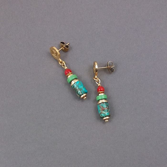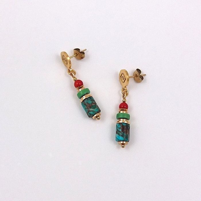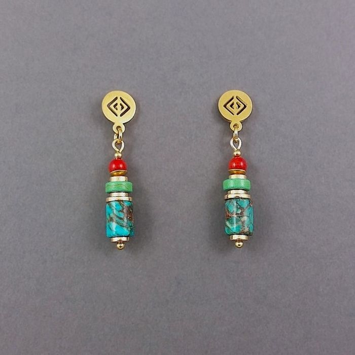 Kolorowe kolczyki słupki z nieuczulającej, pozłacanej stali szlachetnej. Na sztyftach z azteckim motywem zawieszone są wałeczki pięknie wybarwionego, turkusowego jaspisu, krążki złotego hematytu, zielonego howlitu i kuleczki czerwonego korala. Kamienie mają średnicę 6 i 4 mm, a sztyft 8 mm.