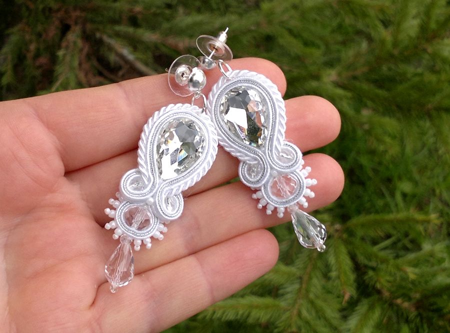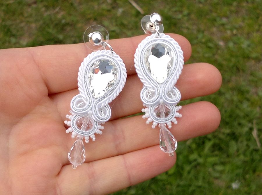 Piękne, jaskrawe, srebrzyste, krystaliczne, białe i niezwykłe kolczyki zostały wykonane ręcznie techniką haftu sutasz.
