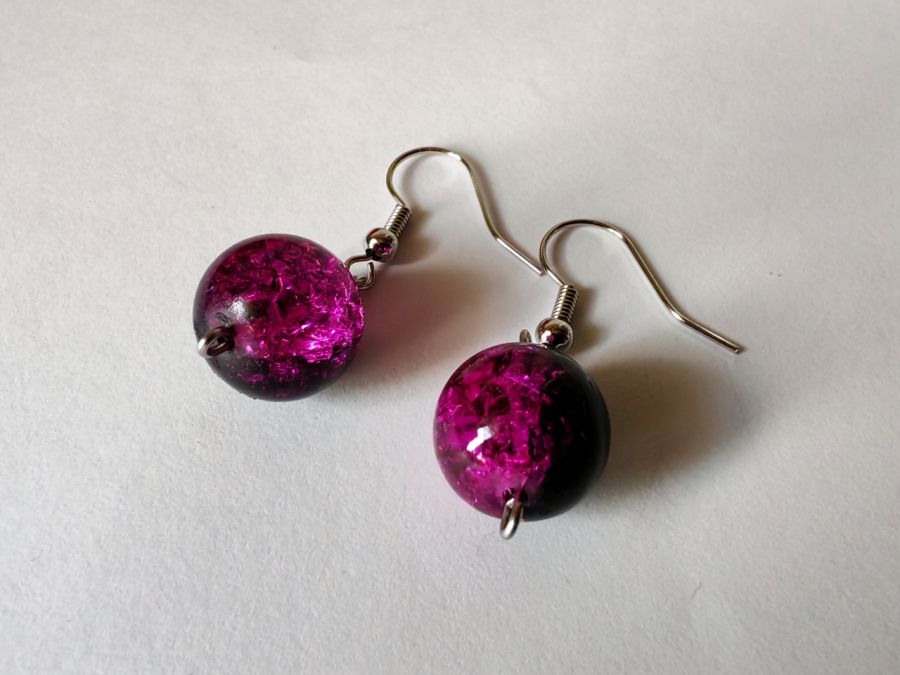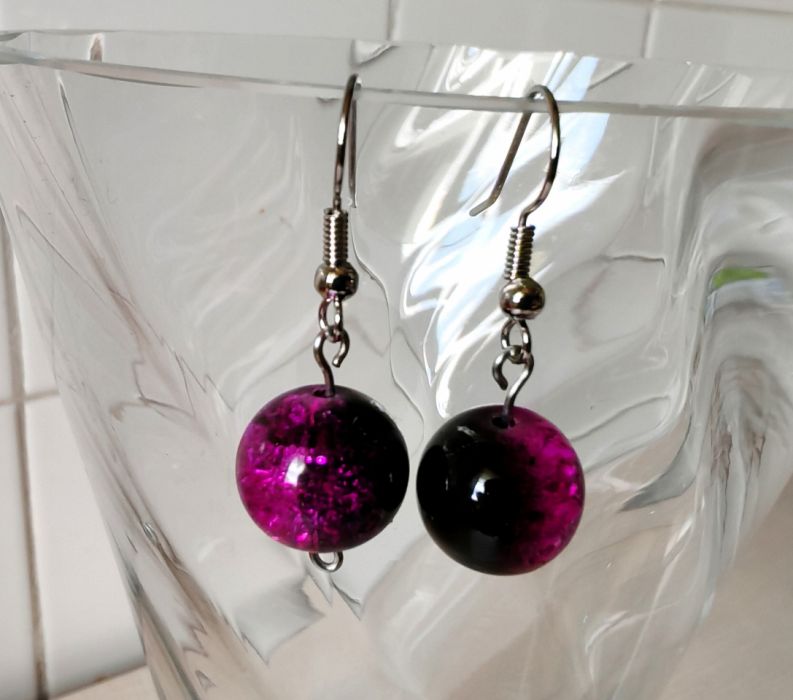 Kolczyki wiszące wykonane z koralików crackle imitujących popękane szkło. Koralik jest dwukolorowy, cieniowany fioletowo-czarny.