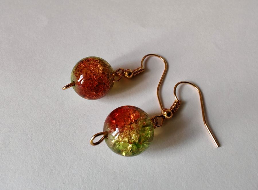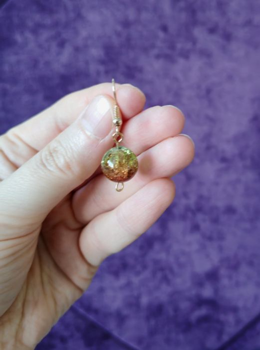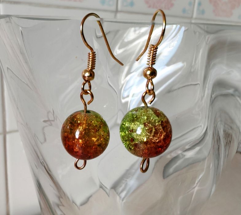 Kolczyki wiszące wykonane z koralików crackle imitujących popękane szkło. Koralik jest dwukolorowy, cieniowany zielono-brązowy.