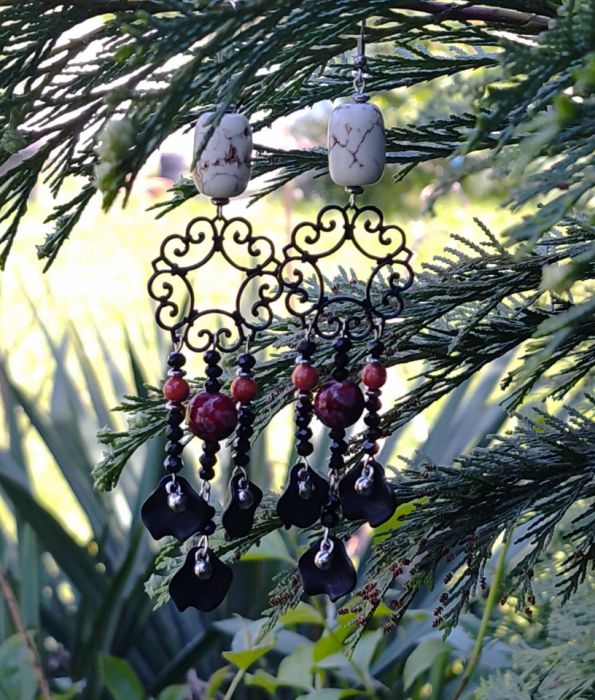 Kolczyki z czarnym filigranem i bryłkami howlitu białego. Kuleczki korala czerwonego i koraliki szklane, akrylowe czarne płatki. Kolczyki długie opadające na ramiona z biglem 13 cm, stalowe bigle, metalowe elementy szkło,koral,howlit,hematyt,
