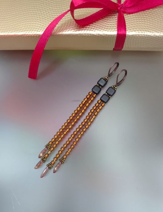 Kolczyki skromne, długie z grotami szklanymi. Kolczyki w kolorze czarnym i złoto brązowym. Bardzo delikatne. Bigiel metalowy zamknięty w kolorze miedzi. Długość kolczyka z biglem 10 cm
