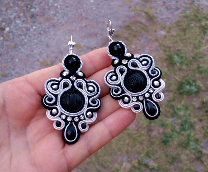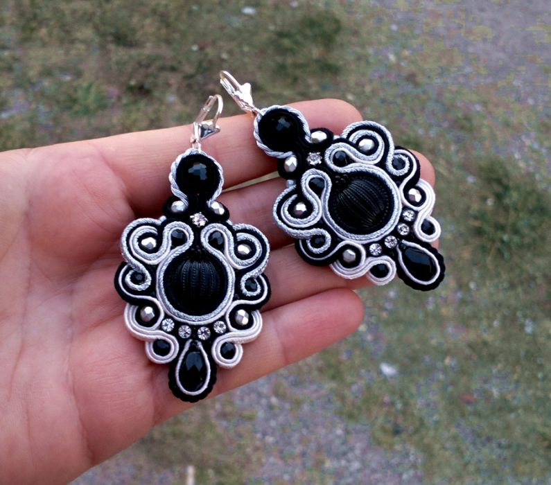 Klasyczne połączenie kolorów czarnego, srebrnego, ecru oraz dodanie kryształów prawdziwej cyrkonii które cudownie się mienią diamentowym połyskiem nie tylko na słońcu, a w dodatku wieczorem przy sztucznym nawet słabym oświetleniu, sprawia że kolczyki prezętują się przepięknie i przyciągają wzrok robiąc wielkie wrażenie!!!