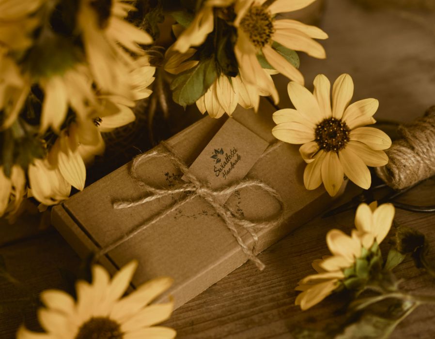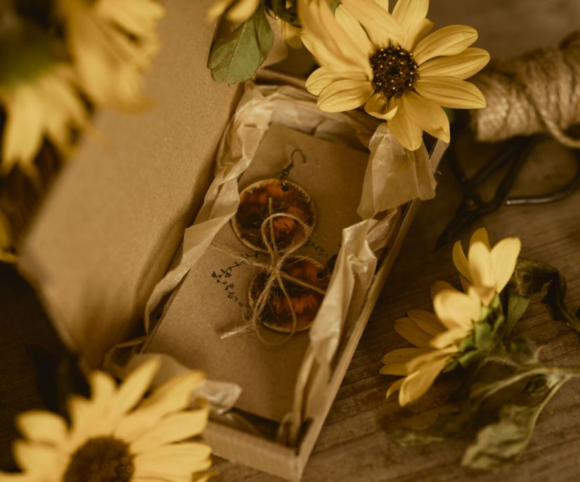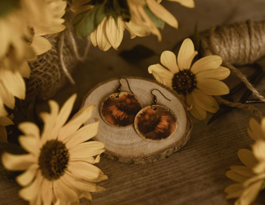 Drewniane kolczyki w stylu retro i vintage z kwiatem słonecznika.