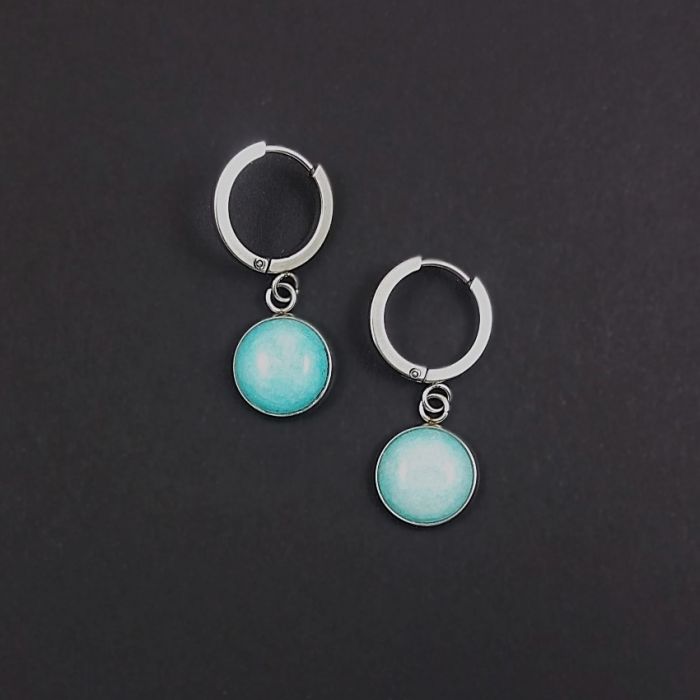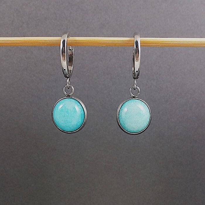 Na wygodnych, okrągłych biglach typu kajdanki zawieszone są okrągłe kaboszony z gładkich jadeitów w kolorze amazonitu (turkusowy). Bigle mają średnicę (zewnętrzną) 16mm, a kamienie z oprawą 12mm. Same jadeity mają średnicę 10mm.