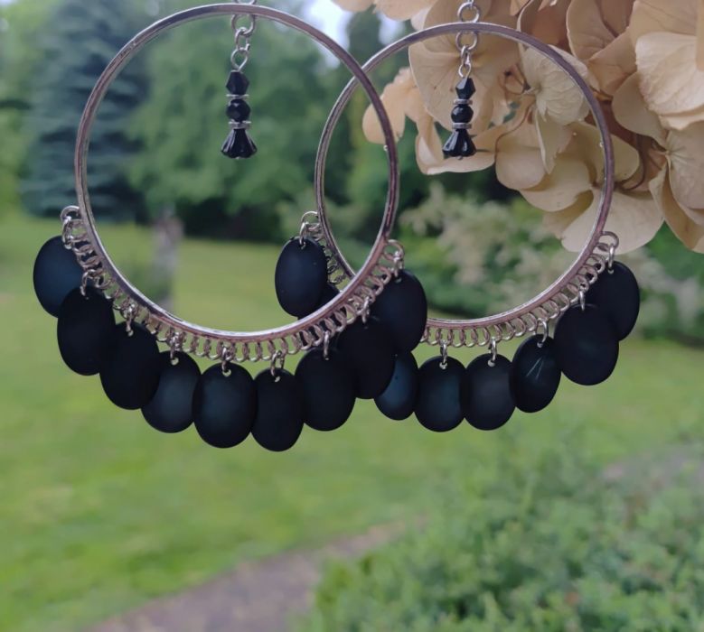 Kolczyki Na metalowej bazie koraliki płaskie oliwki czarne akrylowe lekkie i kwatek, oponki szklane , przekładki hematyt. Średnica koła 6 cm, bigle stal, baza kolczyka to gotowy produkt metalowy. Długość kolczyka z biglem 10 cm