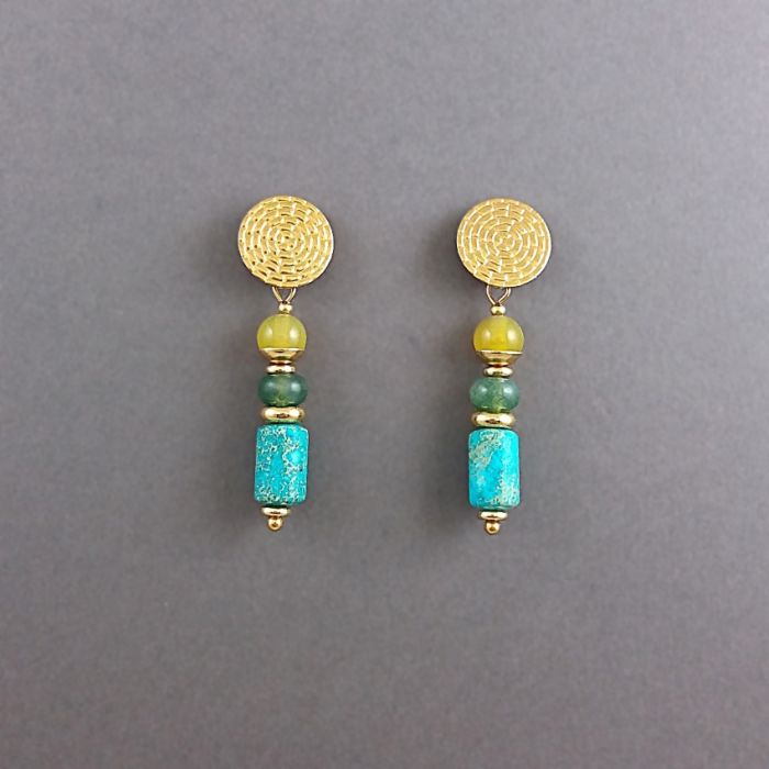 Wiszące kolczyki z naturalnych kamieni. Na wygodnych, okrągłych sztyftach "gniecionych" jak plecionka, zawieszone są słupki z turkusowego jaspisu, oponki z zielonego agatu i gładkie kulki z żółto zielonego agatu. Kamienie mają średnicę 6 mm, a sztyfty 10 mm. Elementy w złotym kolorze wykonane są z nieuczulającej, pozłacanej stali szlachetnej.