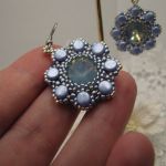 Koralikowe kolczyki w niebieskościach. Kryształek rivoli z żywicy w mleczno opalizującym kolorze jasnego błękitu. Opleciony koralikami Toho w trzech kolorach i pięknie modrymi koralikami Pellet. Bigle ze stali szlachetnej. Średnica kolczyka 3,5cm, długość całkowita 5cm.