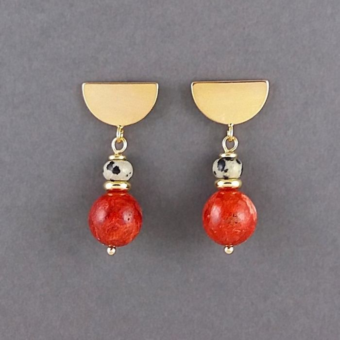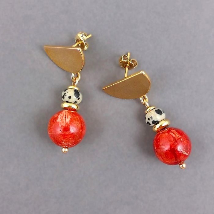Efektowne kolczyki z gładkich kul korala bambusowego (lekkie), o średnicy 12mm, w pięknym, niejednolitym kolorze jesiennych liści, oponek jaspisu dalmatyńskiego, o średnicy 6mm i złotych przekładek ze stali szlachetnej. Świetne, wygodne sztyfty w kształcie półokręgu z nieuczulającego, pozłacanego mosiądzu (premium). Sztyfty są wielkości 16x10mm.