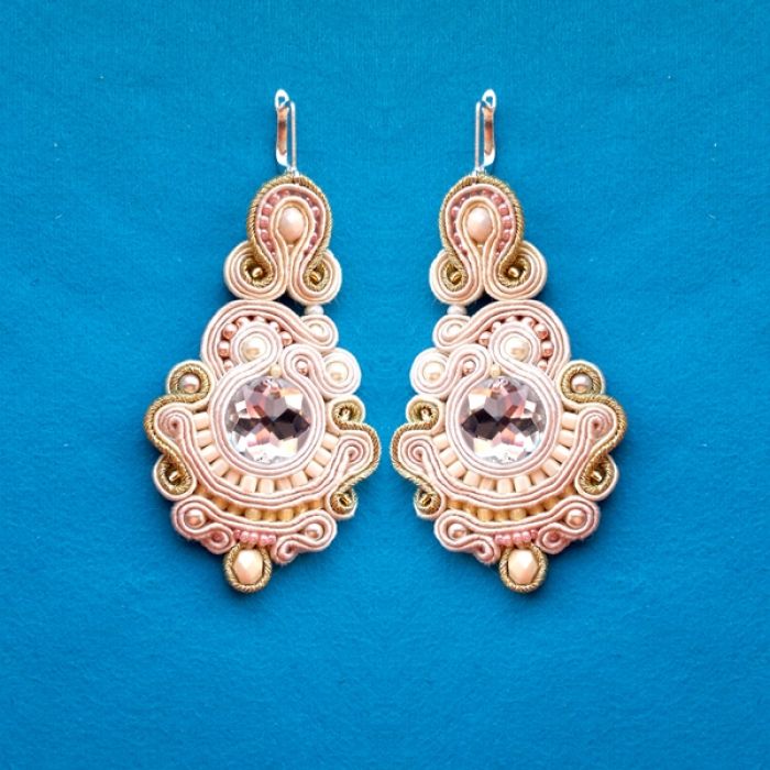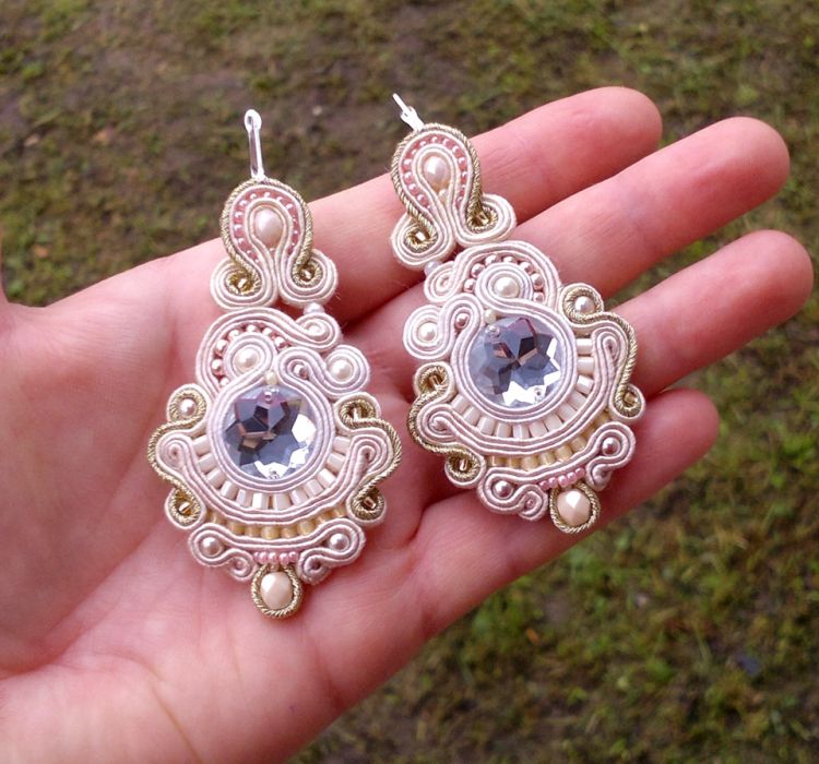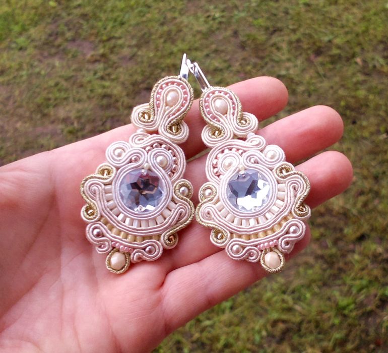Piękne, lśniące, bogate i efektowne kolczyki zostały wykonane ręcznie techniką haftu sutasz. Kolory: jasny krem, ecru, ivory, złoto, pudrowy róż, morelowy.
