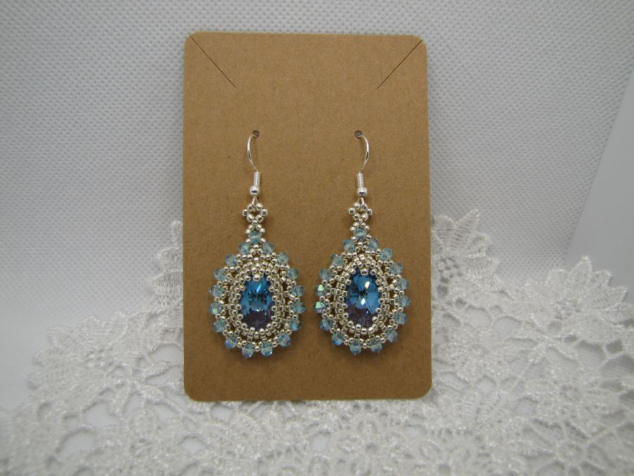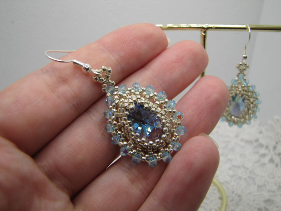 Urokliwe i pięknie mieniące się kolczyki powstałe z kryształków Migdał 16mm Aquamarine AB Swarovski oplecionych czasochłonną metodą beadingu koralikami Japońskiej firmy Toho w kolorze srebrzystym oraz kryształkami czeskimi bicone 3mm. Bigle z antyalergicznej stali szlachetnej. Długość kolczyka z biglami 5cm, szerokość 2cm.