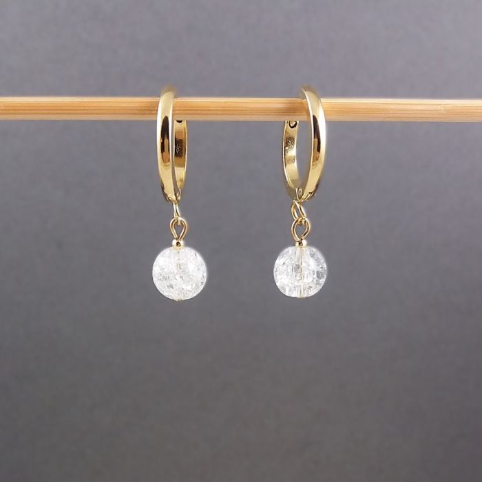 Eleganckie, subtelne kolczyki z nieuczulającej, pozłacanej stali szlachetnej (ładny, jasnozłoty kolor). Na wygodnych biglach kołach, o średnicy (zewnętrznej) 1,7cm, zawieszone są gładkie kulki z kwarcu lodowego (spękane), o średnicy 8mm.