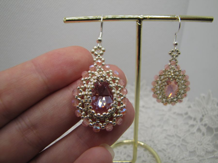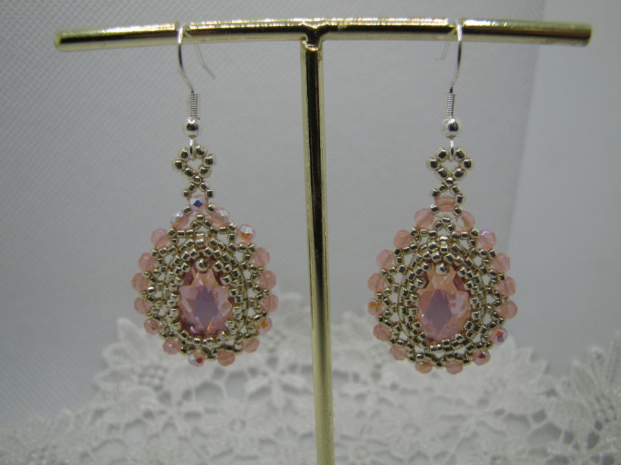 Mieniące się delikatnym blaskiem kolczyki wykonane z kryształów Swarovski Migdał 16mm Light Rose AB oplecionych czasochłonną metodą beadingu koralikami Toho w kolorze srebrzystym i drobnymi kryształkami Fire polish w odcieniu bladoróżowym. Bigle z antyalergicznej stali szlachetnej. Długość kolczyków z biglami 5cm, szerokość 2cm.