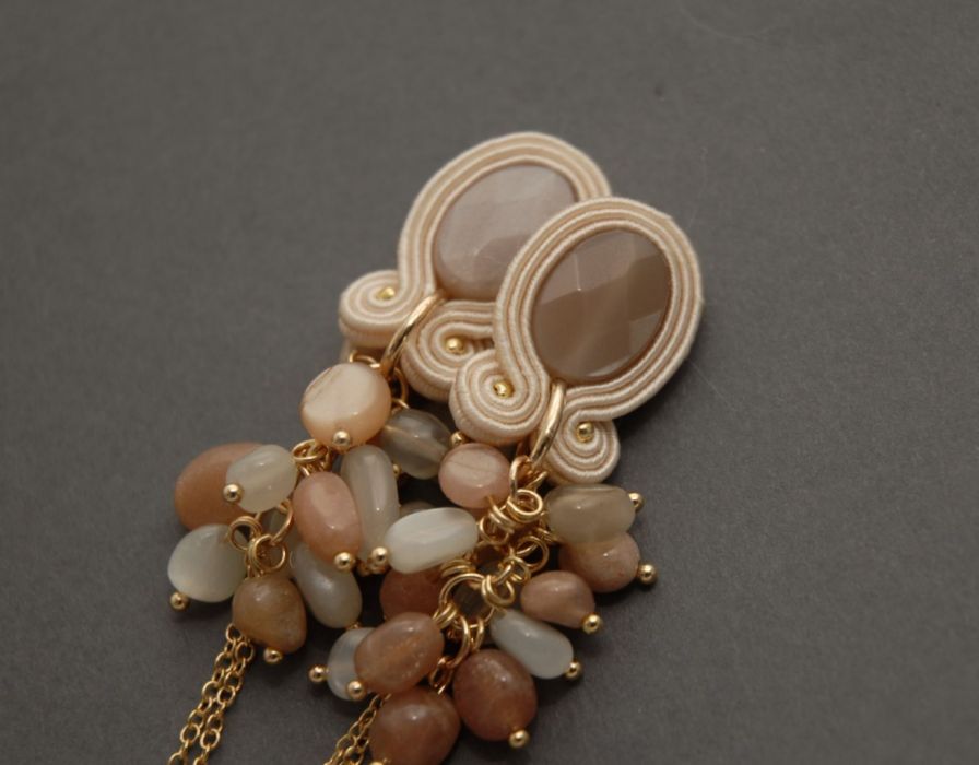 Kolczyki lub klipsy zrobione techniką sutasz, ozdobione dużymi, fasetowanymi i drobnymi kamieniami słonecznymi. Drobne kamyki zamontowane są na pozłacanym łańcuszku.
