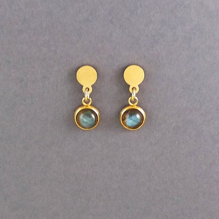 Minimalistyczne, delikatne kolczyki z nieuczulającej, pozłacanej stali szlachetnej. Na wygodnych, malutkich, okrągłych sztyftach zawieszone są kaboszony z labradorytów. Kamienie pięknie błyszczą rzucając migotliwe, niebieskie refleksy.