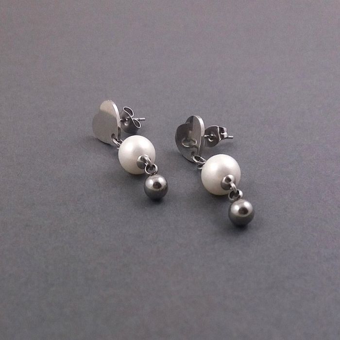 Delikatne i eleganckie, wiszące kolczyki ze stali szlachetnej, w pięknym kolorze starego srebra. Na wygodnych sztyftach w kształcie serduszek, zawieszone są białe, satynowe perły seashell (perły z muszli perłopławów), o średnicy 8mm i malutkie kuleczki ze stali, o średnicy 4mm.