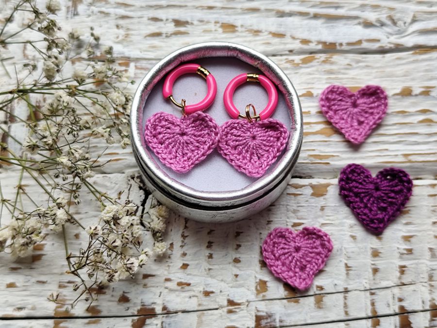 Nazwa produktu: Kolczyki serduszka szydełkowe z zapięciem z emalii - różowe.