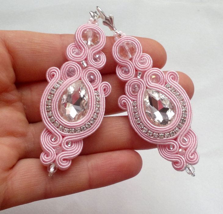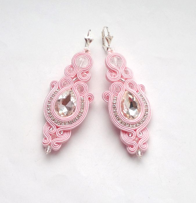 Piękne, efektowne kolczyki w kolorze jasno różowym zostały wykonane ręcznie pracochłonną techniką haftu sutasz. Robią wielkie wrażenie!