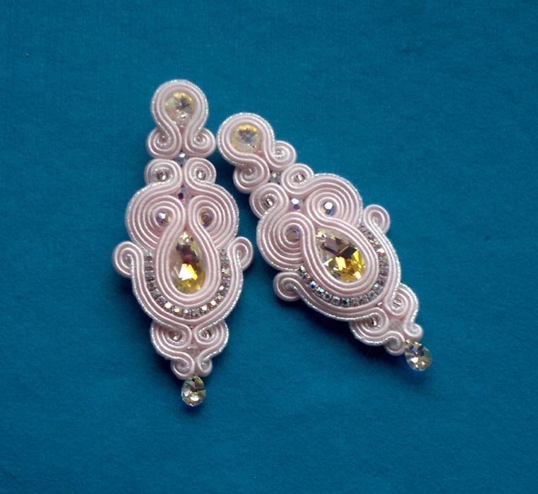Piękne, efektowne kolczyki w kolorze bardzo jasno różowym zostały wykonane ręcznie pracochłonną techniką haftu sutasz. Robią wielkie wrażenie!