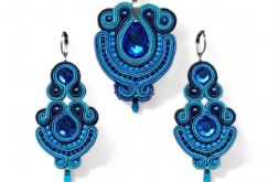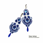 Piękne unikatowe kolczyki wykonane czasochłonną metodą haftu sutasz, zaprojektowane i wykonane własnoręcznie z niezwykłą precyzją i starannością. Kolczyki wykonane z chabrowych koralików oraz kryształków oprawionych białym i chabrowym sznurkiem sutasz. Długość całkowita ok 8 cm, szerokość do 2,5 cm. Bigle antyalergiczne w kolorze srebrnym. Z tyłu podklejone granatowym filcem.
