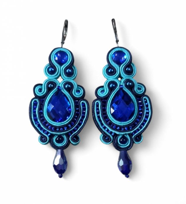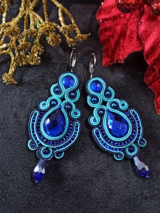 Piękne unikatowe kolczyki wykonane czasochłonną metodą haftu sutasz, zaprojektowane i wykonane własnoręcznie z niezwykłą precyzją i starannością. Kolczyki wykonane z kobaltowych koralików oraz kryształków oprawionych turkusowym i granatowym sznurkiem sutasz. Długość całkowita ok 8,5 cm, szerokość do 3 cm. Bigleze stali szlachetnej w kolorze srebrnym. Z tyłu podklejone czarną skórką.