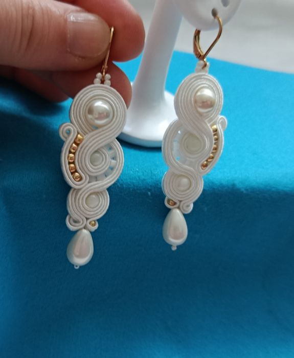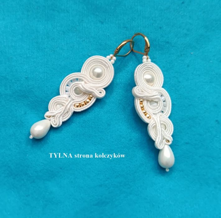 Piękne, efektowne, perłowe kolczyki zostały wykonane ręcznie pracochłonną techniką haftu sutasz w kolorze ivory - śmietankowa biel, to jest kolor prawie biały z lekkim kremowym odcieniem, jaśniejszy od ecru, i złotym.