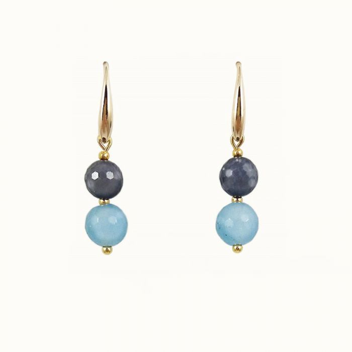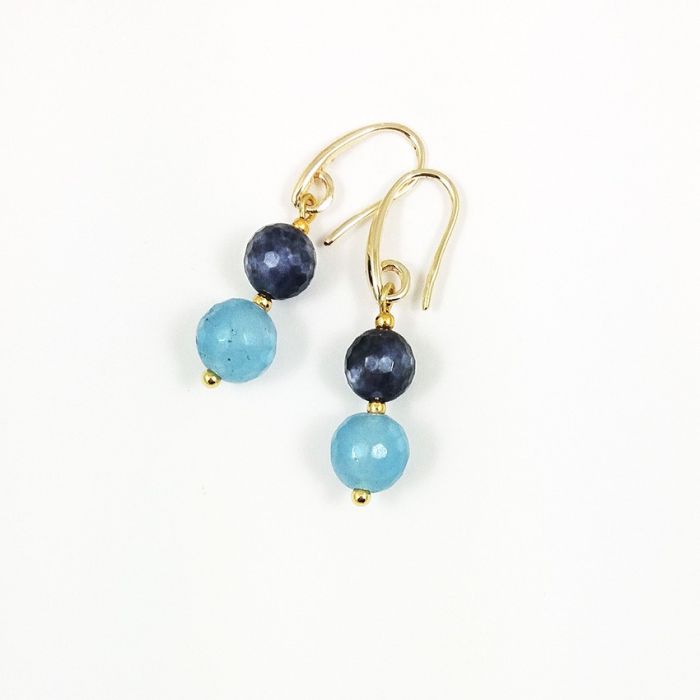 Delikatne, bardzo twarzowe kolczyki. Na wygodnych otwartych biglach zawieszone są dwie kulki z fasetowanych jadeitów, w pięknym kolorze pochmurnego nieba i fasetowanych szafirów.