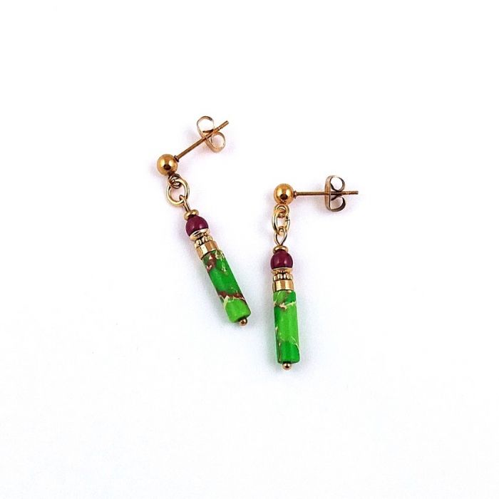 Na sztyftach kulkach zawieszone są słupki z jaspisu, w soczysto zielono bordowym kolorze, przekładki ze stali i kuleczki z rubinu. Kamienie mają średnicę 4 mm.