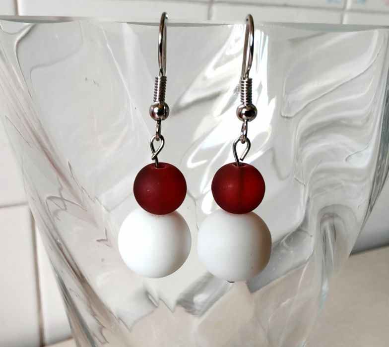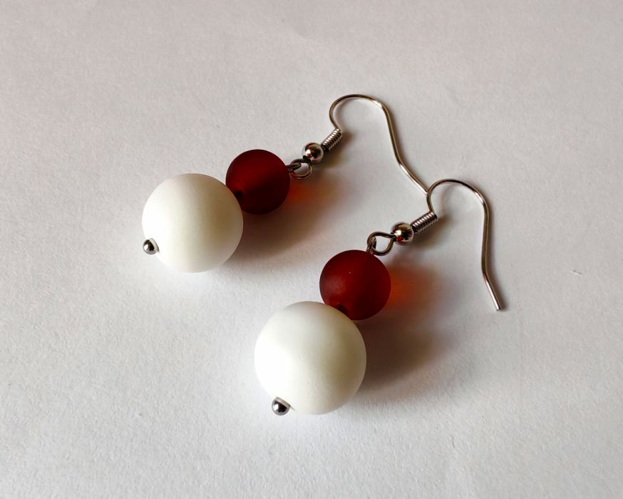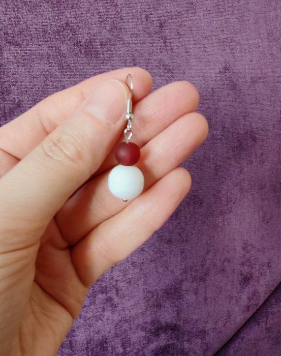 Kolczyki wiszące ze szklanych, matowych koralików - kolor biały i bordowy.