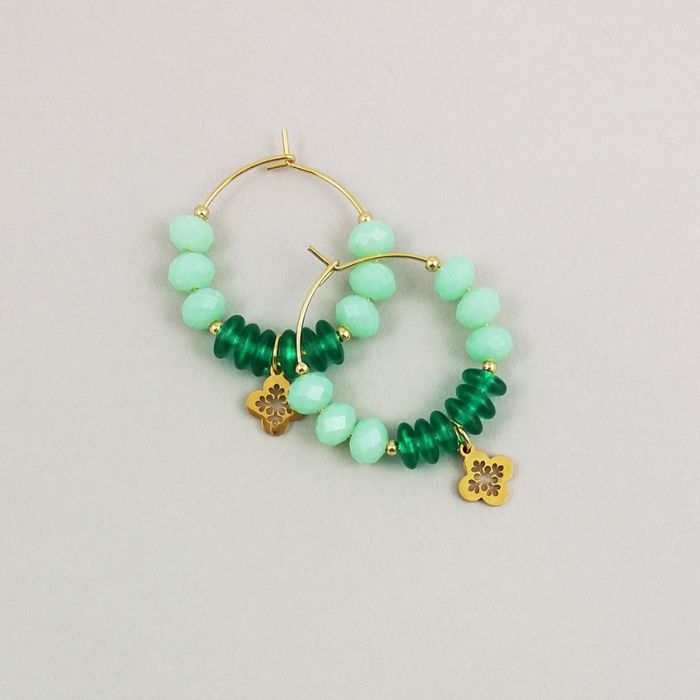 Urocze, leciutkie kolczyki koła z nieuczulającej, pozłacanej stali szlachetnej. Koła mają średnicę 2,5cm. Dekory to fasetowane oponki ze szkła w seledynowym kolorze, zielone, lekko przezroczyste krążki z czeskiego szkła i złote kuleczki ze stali. W roli zawieszek malutkie (8mm) złote koniczynki marokańskie ze stali.