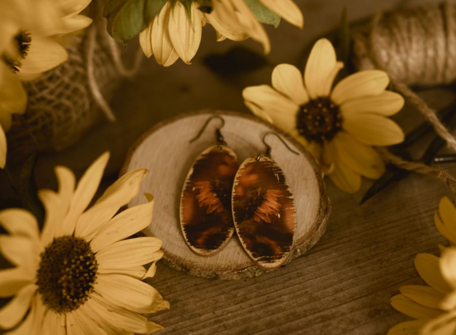 Drewniane kolczyki w stylu retro i vintage z kwiatem słonecznika.