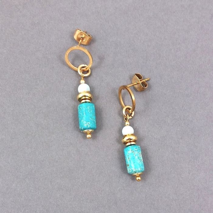 Urocze, bardzo dziewczęce kolczyki z nieuczulającej, pozłacanej stali szlachetnej. Na wygodnych sztyftach kółkach zawieszone są wałeczki turkusowego jaspisu, oponki ze stali i malutkie kuleczki z amazonitu. Kamienie mają średnicę 6 i 4 mm.