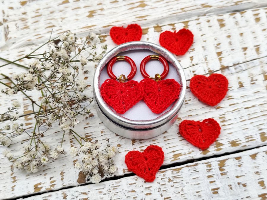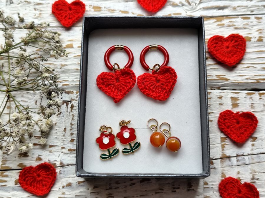 Subtelne, ręcznie wykonane kolczyki z szydełkowanymi serduszkami. Delikatne, a jednocześnie wyjątkowe – dzięki wymiennym zawieszkom możesz łatwo zmieniać ich charakter i dopasować je do swojej stylizacji.