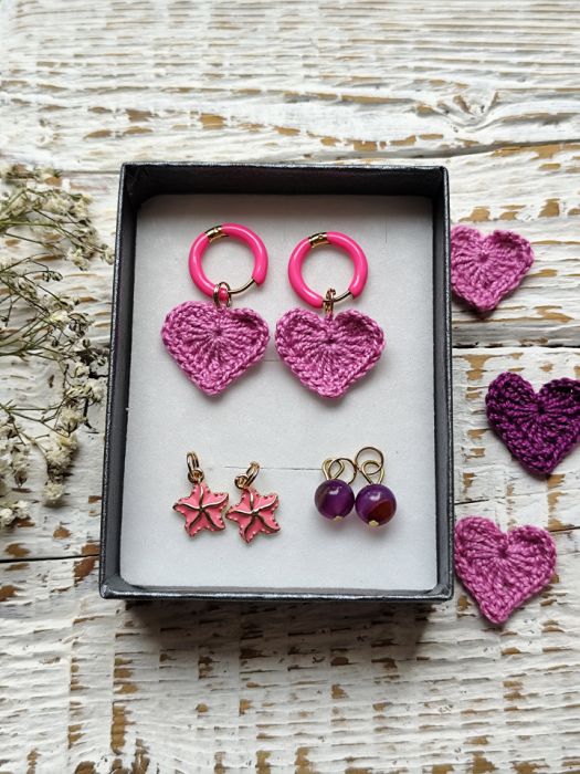 Wyjątkowe kolczyki z ręcznie szydełkowanymi serduszkami w subtelnym, pastelowym odcieniu różu. Wykonane z wysokiej jakości kordonka, zachwycają precyzją i delikatnym wyglądem. Dzięki wymiennym zawieszkom możesz dopasować je do stylizacji i okazji, tworząc za każdym razem nową kompozycję.