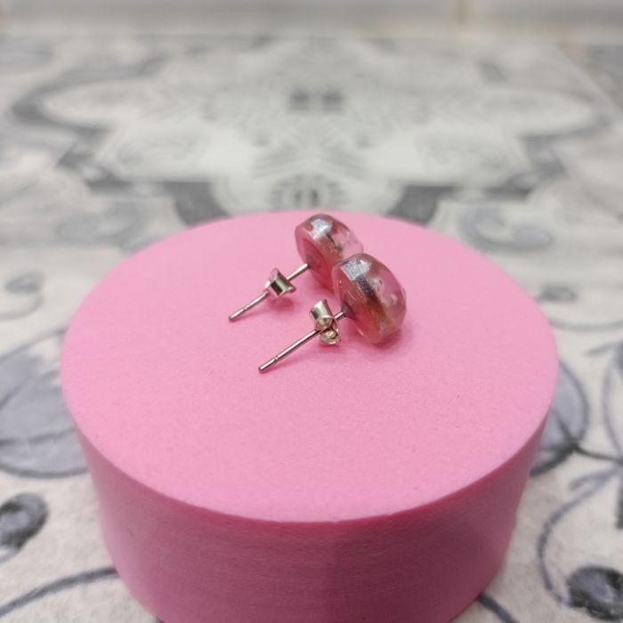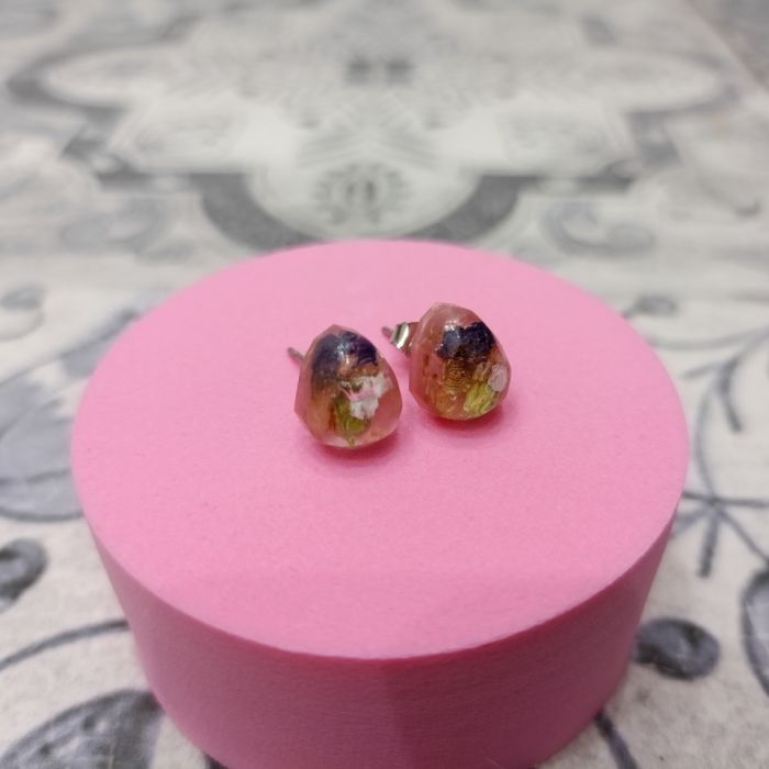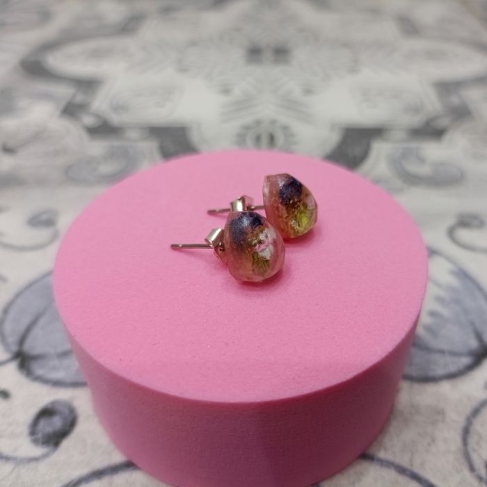 Delikatne, ręcznie wykonane kolczyki z żywicy w odcieniu subtelnego różu. W ich wnętrzu zostały zatopione prawdziwe listki kwiatów – każdy egzemplarz to mała kapsuła czasu, w której zaklęta jest ulotność natury.