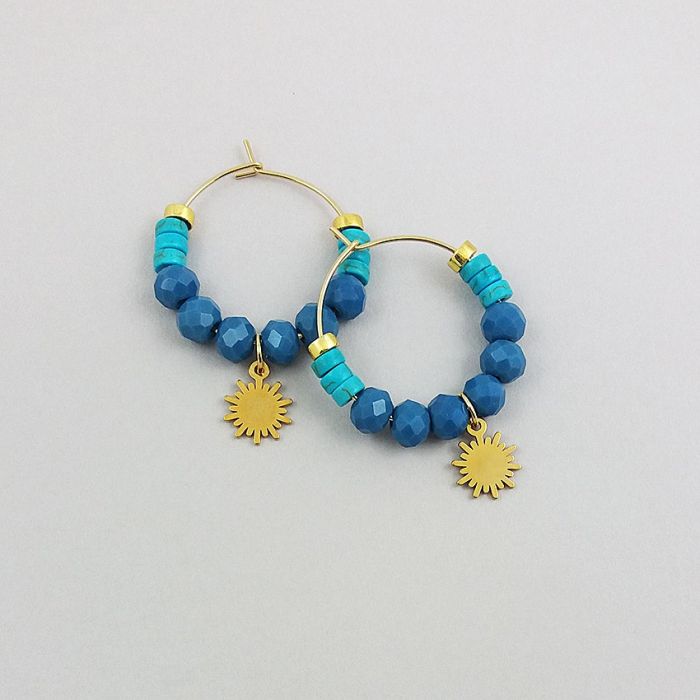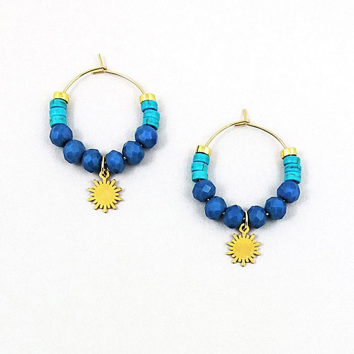 Urocze, delikatne kolczyki koła z nieuczulającej, pozłacanej stali szlachetnej. Koła mają średnicę 2,5cm. Dekory to fasetowane oponki ze szkła, w pięknym kolorze pochmurnego nieba (zdjęcia niestety nie oddają tego koloru), krążki howlitu w kolorze błękitnym i krążki złotego hematytu. Zawieszki malutkie złote słoneczka, ze stali szlachetnej mają średnicę 9mm.