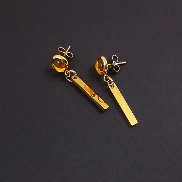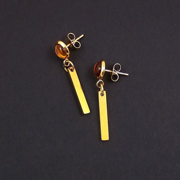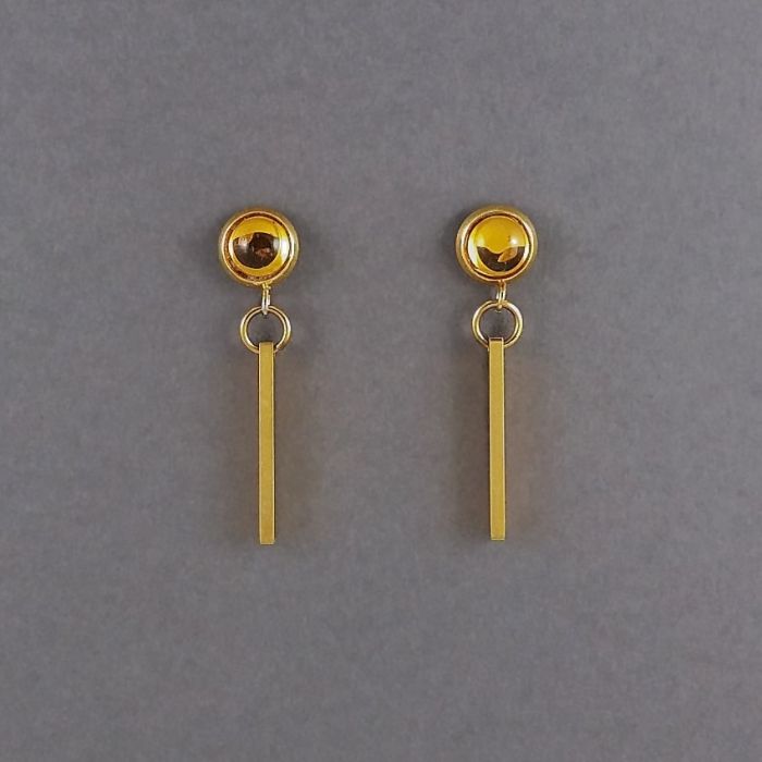 Eleganckie, z nutką nonszalancji kolczyki wykonane z nieuczulającej, pozłacanej stali szlachetnej. Na sztyftach, niewielkich kaboszonach z żółtego, czeskiego szkła zawieszone są patyczki z błyszczącej stali. Kaboszony mają średnicę 8mm (razem z oprawą), a zawieszki mają wymiary: 20 x 3 x 2mm.