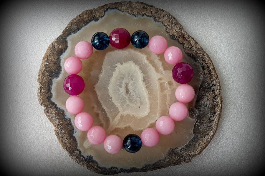 Śliczna bransoletka wykonana została z kwarcu niebieskiego ( kulki 10mm ), morganitu różowego ( fasetowane kulki 10 mm ) oraz z jadeitu amarantowego ( fasetowane kulki 12mm ). Wstępnie nośnikiem bransoletki jest żyłka jubilerska, na wyraźne życzenie zamienię na gumkę jubilerską lub na linkę jubilerską z zapięciem typu karabińczyk. Długość bransoletki to +- 18cm , bransoletkę mogę wydłużyć lub skrócić o kolejne kamienie,Proszę przy zakupie dołączyć informację e-mailową o chęci zmian i podać szczegóły.