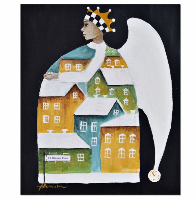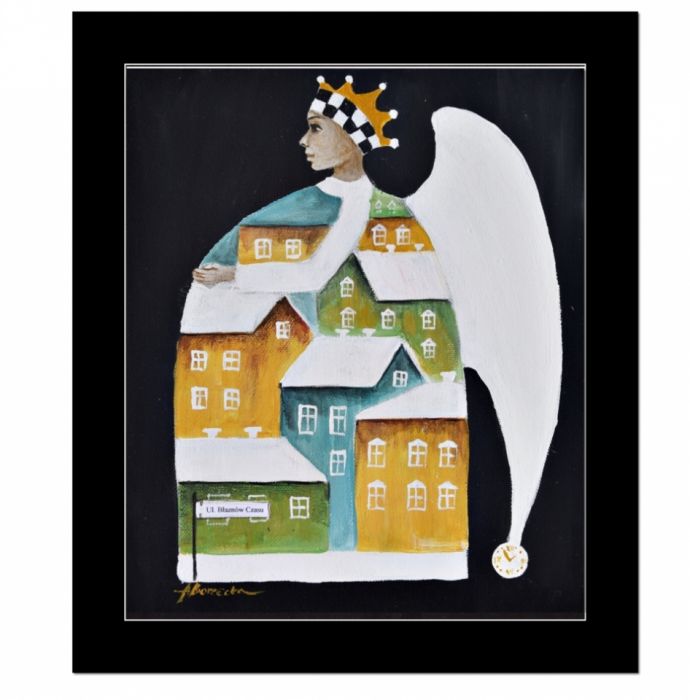 Zadaj pytanie dotyczące produktu: Kolorchatkowo III, obraz anioł kolorowe domki ręcznie malowany na płótnie