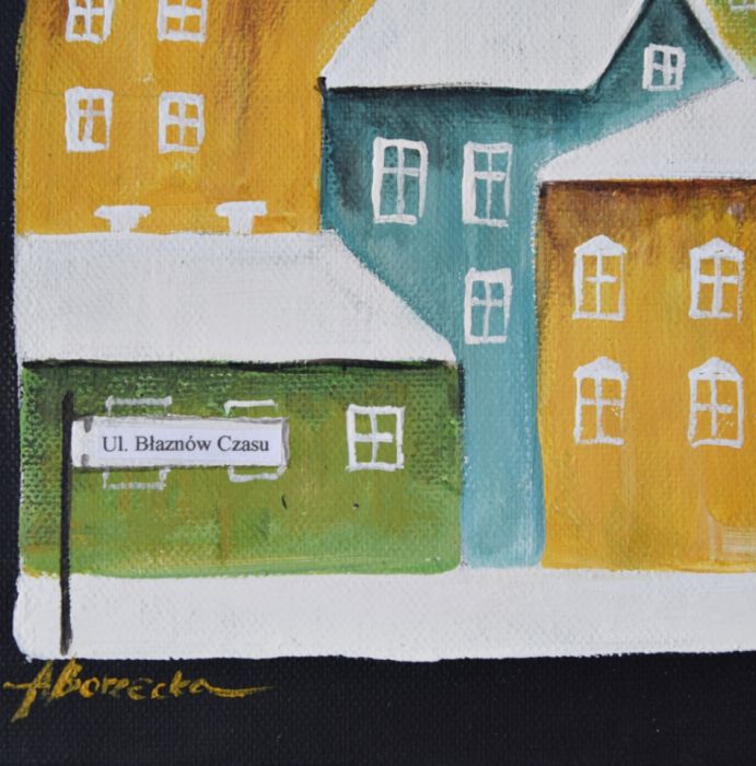 Obraz z serii Kolorchatkowo, odc. 1, malowany w technice akrylowej, z elementem collage (nazwa ulicy) na płótnie naciągniętym na blejtram (drewnianą ramę) o grubości ok. 1,5 cm. Rozmiar - 25/30 cm. Obraz pokryty jest werniksem dla ochrony przed wilgocią. Sygnowany.