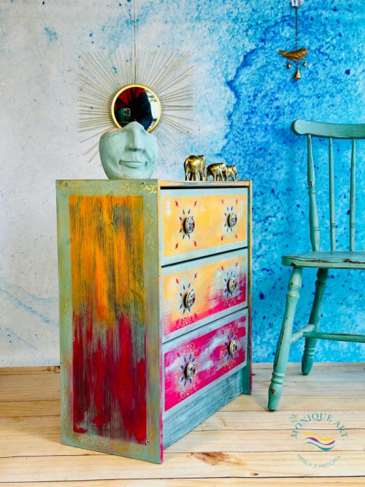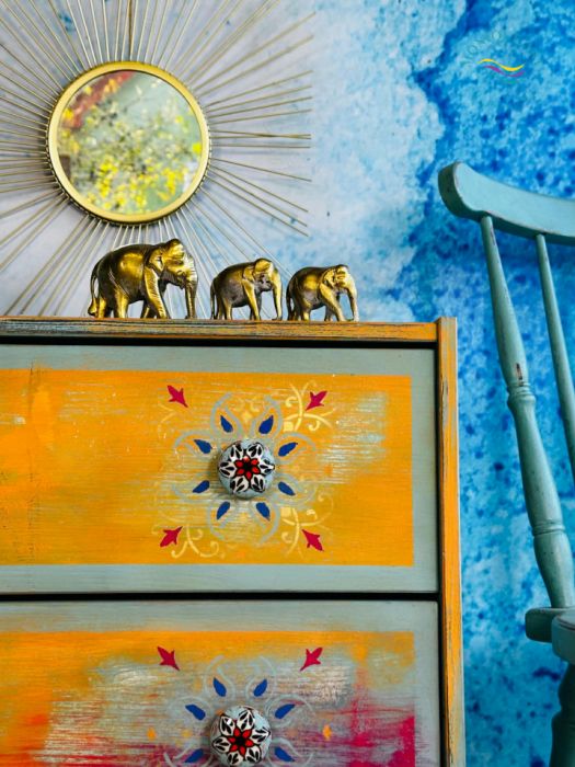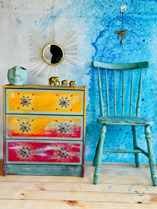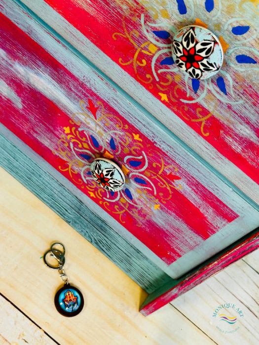 Zadaj pytanie dotyczące produktu: Kolorowa komoda w orientalnym klimacie, trzy szuflady, ceramiczne gałki