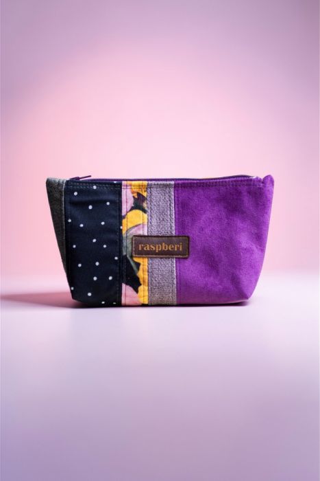 Średniej wielkości kosmetyczka wykonana kilku rodzajów tkanin. Stworzona w duchu no waste.