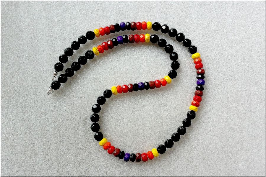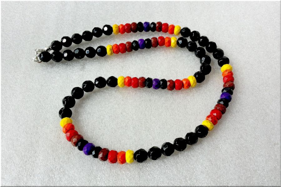 Naszyjnik wykonany został z pięknych czarnych onyksów - fasetowane kulki 8mm oraz kolorowych turkusów - fasetowane oponki 7/4mm.Długość naszyjnika około 56cm.