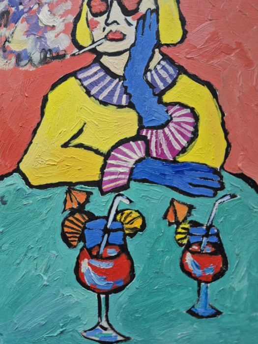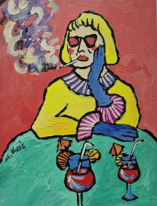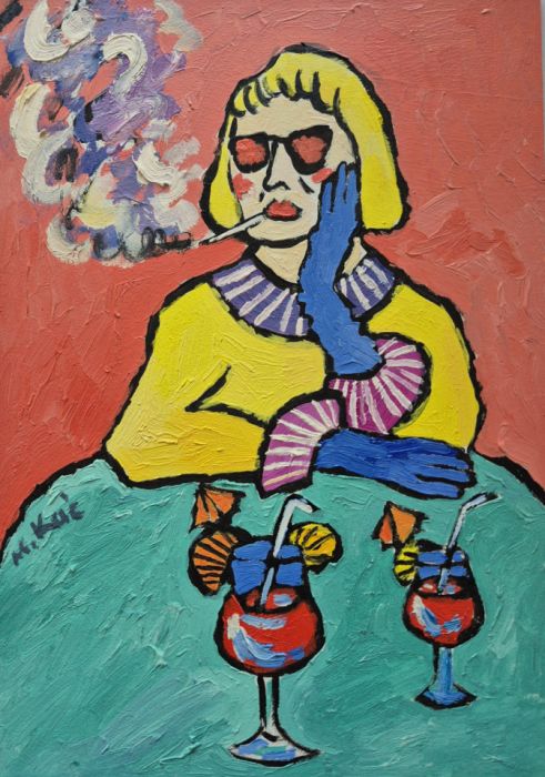 Obraz prezentuje postać kobiety, która siedzi przy stole o turkusowej powierzchni. Jej wyraziste, żółte włosy kontrastują z czerwonym tłem. Czy to wygląda na relax czy może na głębokie zamyślenie ? Ona ma na sobie jaskrawą, żółtą bluzkę i fioletowy szal, a jej ręka wspiera głowę. Okulary słoneczne i papieros w ustach dodają jej nonszalancji. Dym unosi się spiralnie, tworząc wokół niej artystyczny chaos. Na stole stoją dwa drinki w szklanych kieliszkach, udekorowane plasterkami cytryny i parasolkami.
