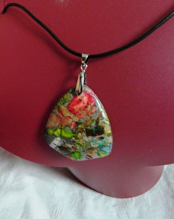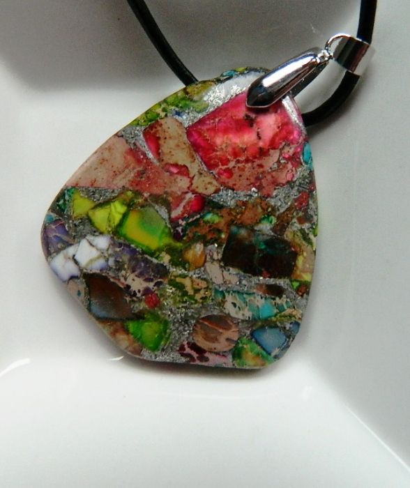 Efektowny wisiorek, z całą pewnością unikatowy, "ubarwienia" naturalnych kamieni są niepowtarzalne.