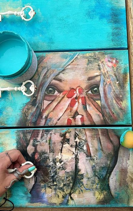 stylizacja : bejca w kolorze dębu rustykalnego i farba kredowa w kolorze turkusu
