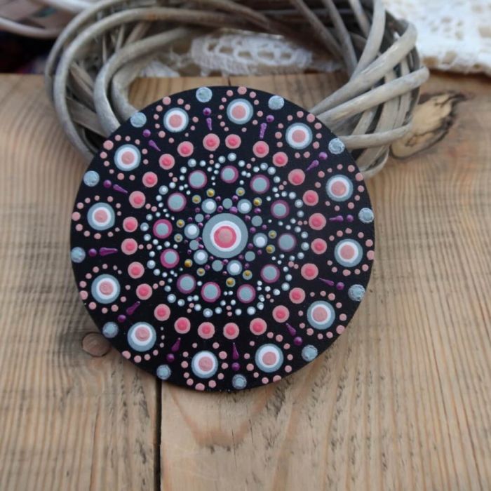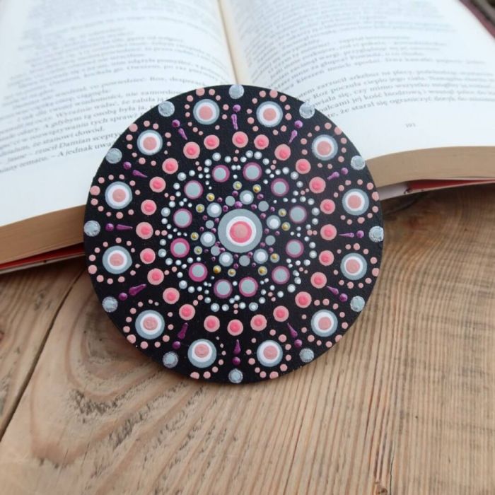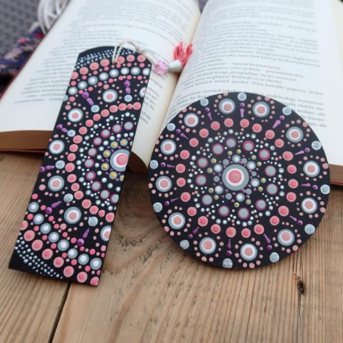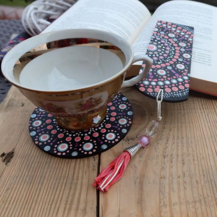 Z przyjemnością przedstawiamy unikalny zestaw składający się z zakładki do książki oraz podkładki pod kubek, wykonanych w technice dot painting.